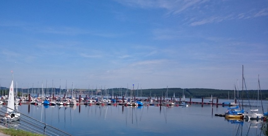 Allein der riesige Hafen in Ramsberg war schon ein Erlebnis. Mit Wind aus westlicher Richtung kreuzten wir zunächst Richtung Enderndorf auf. Wir waren gut unterwegs und kreuzten dann gleich weiter auf Richtung Absberg. Der Wind war so schön gleichmäßig, dass Max den Spinnaker auspackte und wir den ganzen See entlang bis Allmansdorf hinunter segelten.